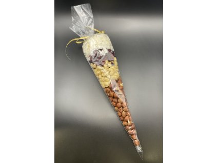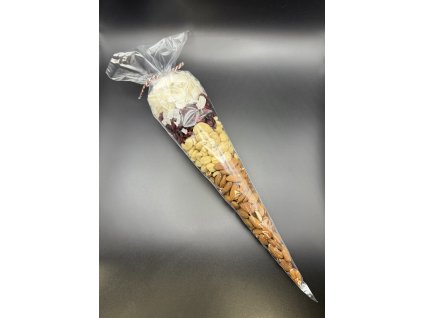 Stylové dárkové balení ve tvaru kornoutu s vyváženým mixem křupavých oříšků, sladkokyselé klikvy (kanadské brusinky)...